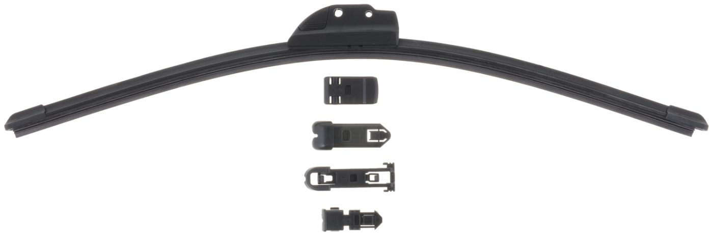 A blended natural rubber with graphite treated wiping edge to reduce friction for a clean and quiet wipe An aerodynamic wind spoiler to create a downward force which ensures consistent wiping at high speeds A patented beam design to resist ice and snow build up for use in extreme cold The Click-On adapter system for quick and easy installation